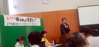 富士市はすでにウォーターPPP導入を決め、9月には契約企業も決まってしまった。地元水道業者は含まれていない。勉強会の主催者に伺ったところ、「できることはやっていく。地元の業者と話してみる」と言っていた。全国的に、施設の老朽化や人口減少を理由として水道料金の値上げが相次いでいるが、憲法と水道法にもとづいて国が財政支援をすべきだと考える。 (池)