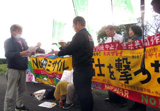 この動きに対し、10月27日の米軍ハイマース実射訓練の際、国道469号線の封鎖地点〔須山〕で抗議行動を行なった。呼びかけは御殿場の平和委員会であり、三島の市民団体をはじめ、県内各地から60人が参加した。参加者は、富士を戦争の拠点にするな、ロケット砲訓練を止めろ、富士を撃つな、ミサイルを配備するな、東富士をミサイル基地にするなと声をあげた。