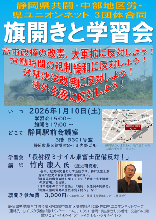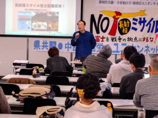 2026年1月10日、静岡市内で、静岡県労働組合共闘会議による学習会「長射程ミサイル東富士配備反対!」がもたれ、50人が参加した。